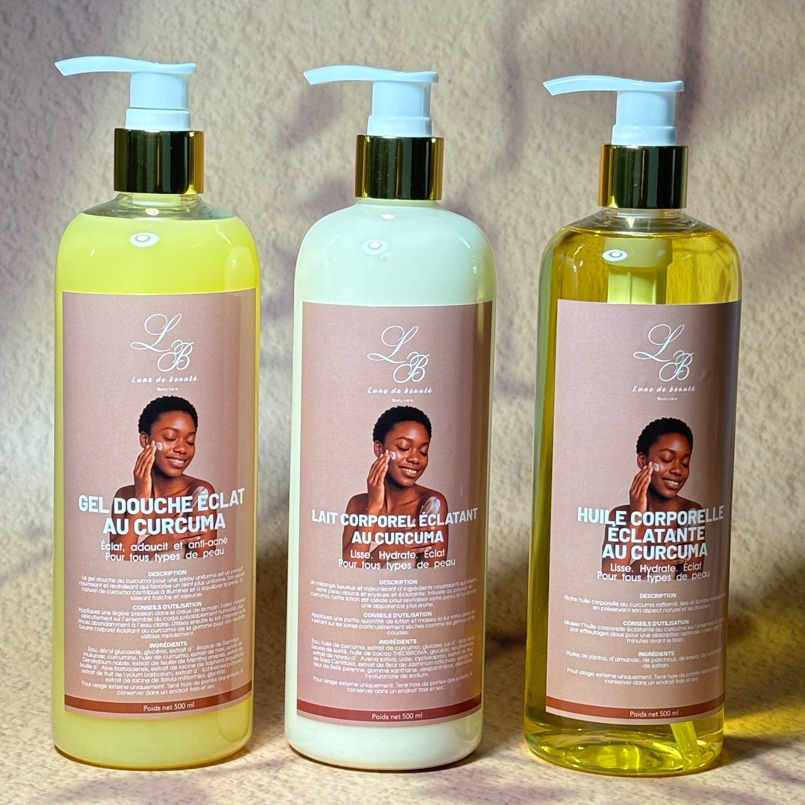 Cette gamme est composée de curcuma comme principe actif. elle est éclatante et agit très efficacement contre les zones noires sur certaines parties de notre corps laissant par les boutons et les cicatrices hyperpigmentation , les brunes, les noirs sur vos doigts ,vos pieds, vos aisselles ect. cette gamme éclaircit toute partie sombre de votre corps de les unifié en donnant un éclat visible et naturel.